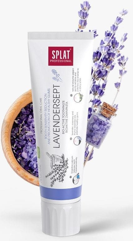 A természetes levendula, rozmaring és kakukkfű olajai antibakteriális hatást nyújtanak, ezenkívül védelmet garantálnak az ínygyulladás és a fogkő ellen. A kalcium és a cink nagyon erős antioxidáns hatással rendelkezik, így az íny és a fogak egészségesek és erősek lesznek. A fehérítő sók és a természetes papain enzim gondoskodik fogaid kíméletes tisztításáról és fehérítéséről. Tökéletesen eltávolítja a lerakódásokat és lesimítja a fogzománcot. Az SPLAT Professional Lavandersept fogkrém érzékeny fogak számára is alkalmas. A kalcium-foszfátnak köszönhetően táplálja a fogazatot, és ezáltal növeli annak ellenállását a külső hatásokkal szemben.